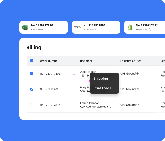 我们集成了多家电子商务平台,订单自动导入,快速完成发货,为您节省时间。
